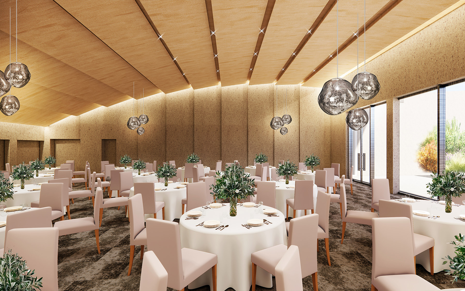 パーティールームやわらかな光と心やすらぐ木の質感が